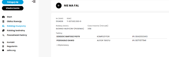 Na tym przykładzie widzimy, że Dawid Podsiadło ma również prawa autorskie do utworu „Nie ma fal” ponieważ jest autorem warstwy tekstowej utworu.